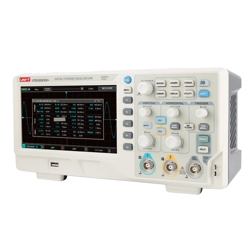 UTD2000CEX+提供多達34種波形參數自動測量功能,幫助用戶快速直觀地測量所需要的參數類型,另有用戶自定義功能,方便篩選用戶感興趣的功能直觀顯示。