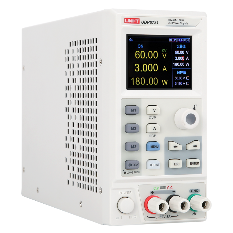 UDP6720系列為用戶提供了功能豐富,操作簡單的人機交互界面,應(yīng)用了2.8‘’高清顯示屏,可以實時顯示電源當前的設(shè)定輸出電壓/電流、實際輸出電壓/電流和保護輸出電壓/電流值;同時用戶還能夠便捷的進行系統(tǒng)的設(shè)置,此人性化設(shè)置可以滿足工程師測試中的多種應(yīng)用需求。