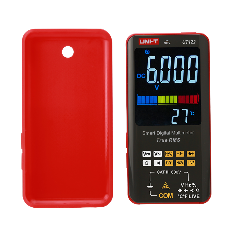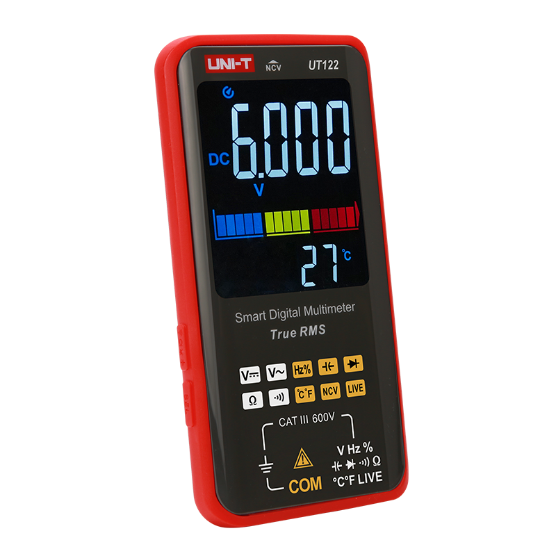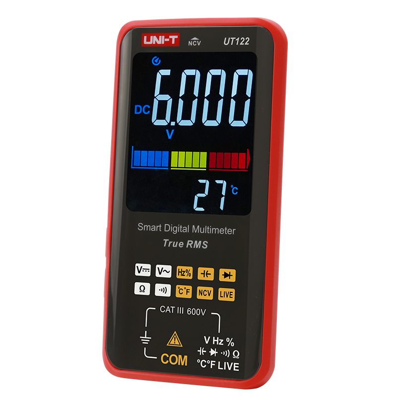 UT122 是一款卡片式智能萬用表,可根據輸入信號自動識別功能檔位及量程,有效降低了操作難度并提高了工作效率,采用EBTN屏顯示設計可使用戶在最大角度獲得清晰讀數;產品依照EN61010-1/61010-2-030/61010-2-33安全標準,設計了全功能防燒保護裝置,確保用戶在CATII600V使用環境內安全操作。產品具備獨特的外觀設計和功能配置,是入門級人士或家庭用戶適用的測量工具。