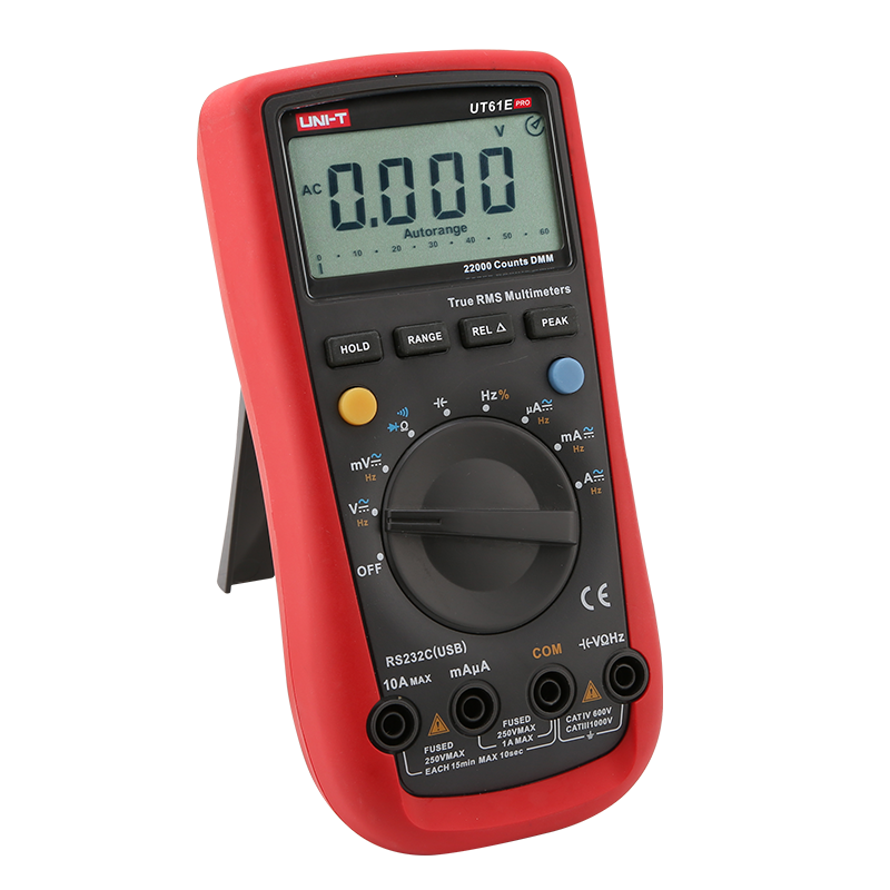 UT61EPRO數(shù)字萬用表是具備高可靠性、高安全性、自動(dòng)量程、手持式萬用表等特點(diǎn)。具有超大屏幕數(shù)字和高解析度模擬指針的同步顯示功能,全量程過載保護(hù)和獨(dú)特的外觀設(shè)計(jì),使之成為性能更為卓越的新一代實(shí)用電工測量儀表。并有RS-232或USB標(biāo)準(zhǔn)數(shù)據(jù)傳輸接口、數(shù)據(jù)保持、相對測量、峰值測量、欠壓提示、背光和自動(dòng)關(guān)機(jī)功能。