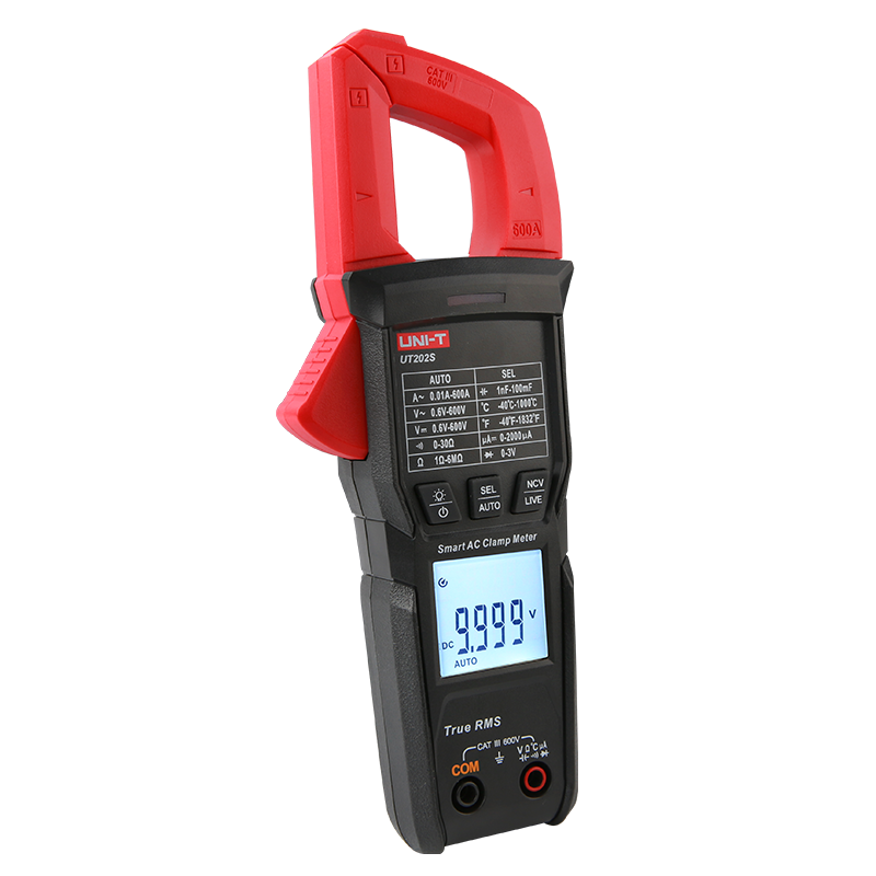 UT202S/UT202BT是一款性能穩定、結構新穎、高可靠性、高安全性的手持式真有效值數字鉗形表。全功能自動量程,9999Counts的顯示位數,性能優越。 UT202S可自動識別測量交/直流電壓、交流電流、電阻和電路通斷;并可通過按鍵選擇,測量電容,二極管、直流微安電流、火線零線檢測(LIVE)、溫度和非接觸式交流電壓感測(NCV)。 UT202BT可測量交/直流電壓、交流電流、低通濾波電壓/電流、浪涌電流、峰值電壓/電流、電阻、電路通斷、電容、溫度和非接觸式交流電壓感測(NCV)。同時具有藍牙功能,可以連接手機APP,實現遠程數據觀測及儀表控制,是廣大用戶理想的檢修儀表。
